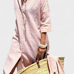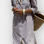 Luna | Stribet skjortekjole forener klassisk elegance med nutidig lethed. Hver detalje afspejler håndværkets omtanke og en arv af tidløst design, mens det stribede mønster i en neutral palet giver et eksklusivt look, der kan bæres år efter år. Stoffet er blødt og åndbart, så du forbliver komfortabel gennem dagen, og den afslappede silhuet flatterer alle kropstyper. Med Luna får du en investering i tidsløs stil og eksklusivitet samt en ejeroplevelse, der føles både fin og funktionel. Produktion i et begrænset antal understreger den velansete samlerappel.