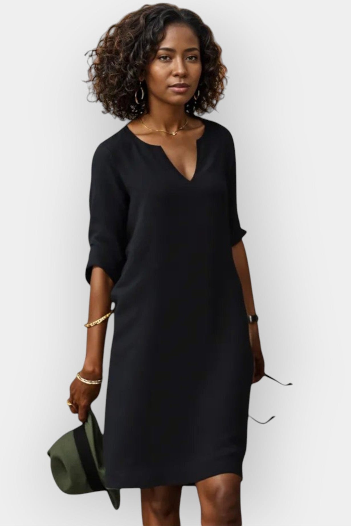 - Elegant snit og silhuet: taljen fremhæves subtilt, mens kjolen glider let over kroppen.